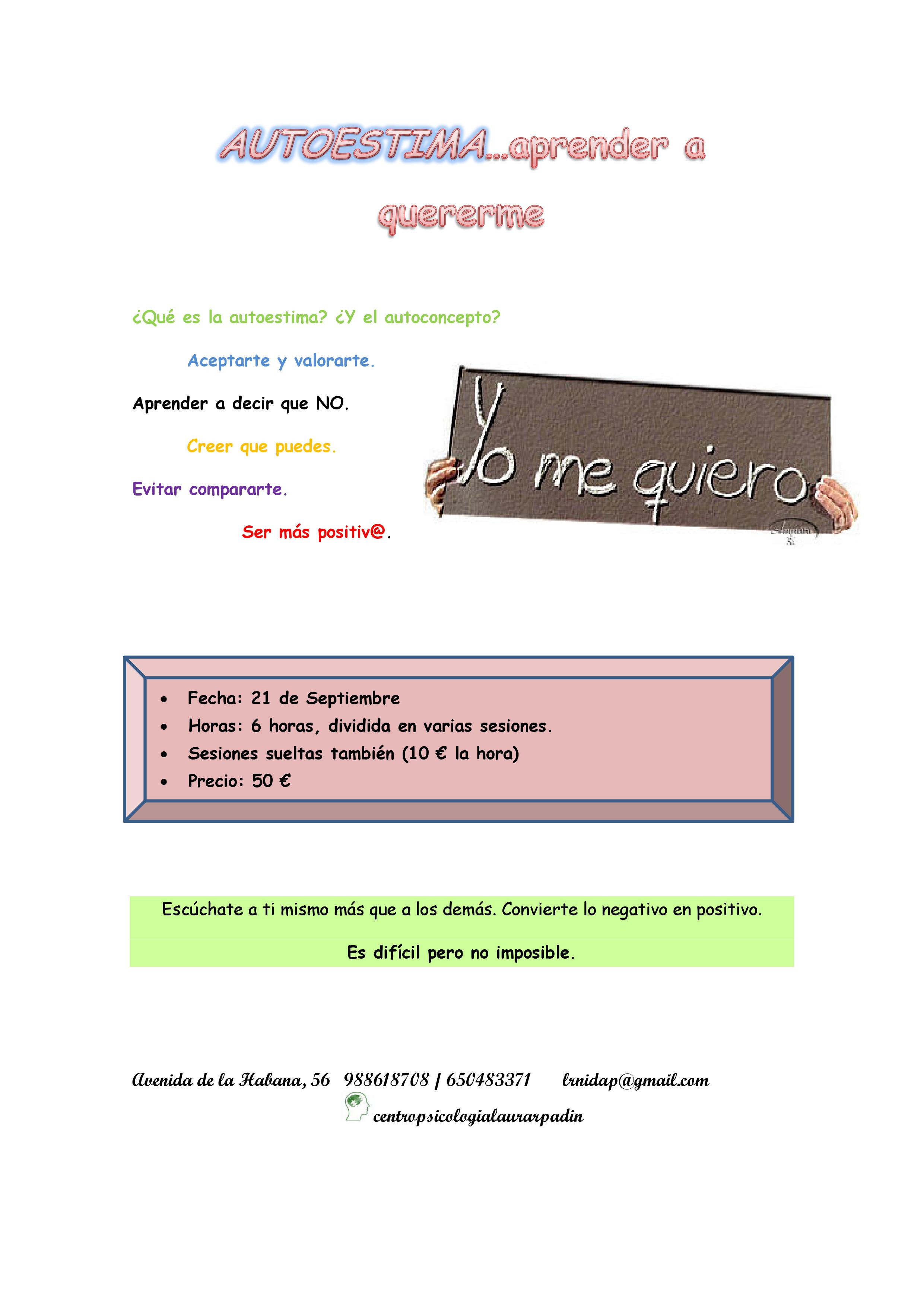 Lo que se intenta con estas sesiones, es construir una autoestima positiva, con la cual poder valorarte y quererte como eres.